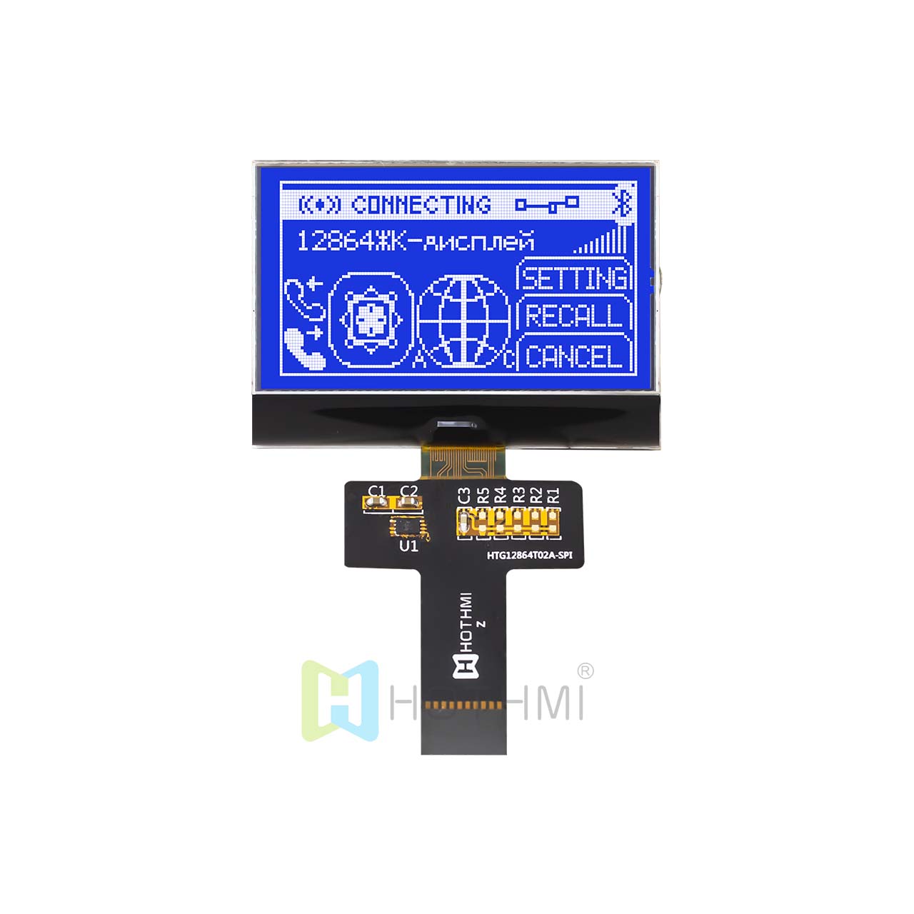 This 2.2" HOT Display 128x64 Graphic Glass Chip (COG) LCD module displays white pigments on a blue background. This transmissive LCD display is carefully designed to allow the backlight to fully penetrate the ambient light under the full penetration of the polarizer, making the display brighter and allowing viewers to clearly see the image; when used in darker environments, the backlight makes the graphics clearly visible, providing optimal visibility and impressive colors. The display has a powerful built-in backlight to provide high contrast and ensure readability of all graphics on the screen.