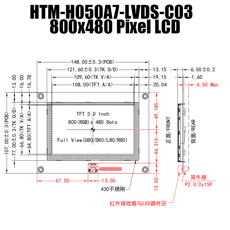5寸 IPS全視角 800x480分辨率 寬溫 TFT LCD顯示面板 LVDS接口 HTM-H050A7-LVDS-C03